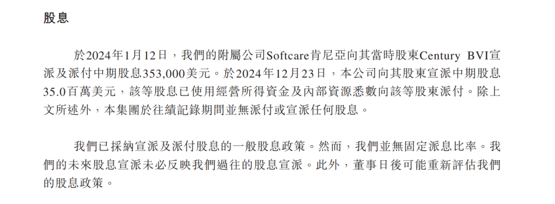 2024年1月,乐舒适的附属公司Softcare肯尼亚向当时股东Century BVI派息35.3万美元。2024年12月,公司宣布派发中期股息3500万美元,约占2024年净利润的37%。