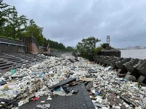 原本被人类丢在江边或海里的垃圾在一场台风后尽数”还“给了人类。图为2021年台风”烟花过境后,上海滨江森林公园的沿江堤岸。