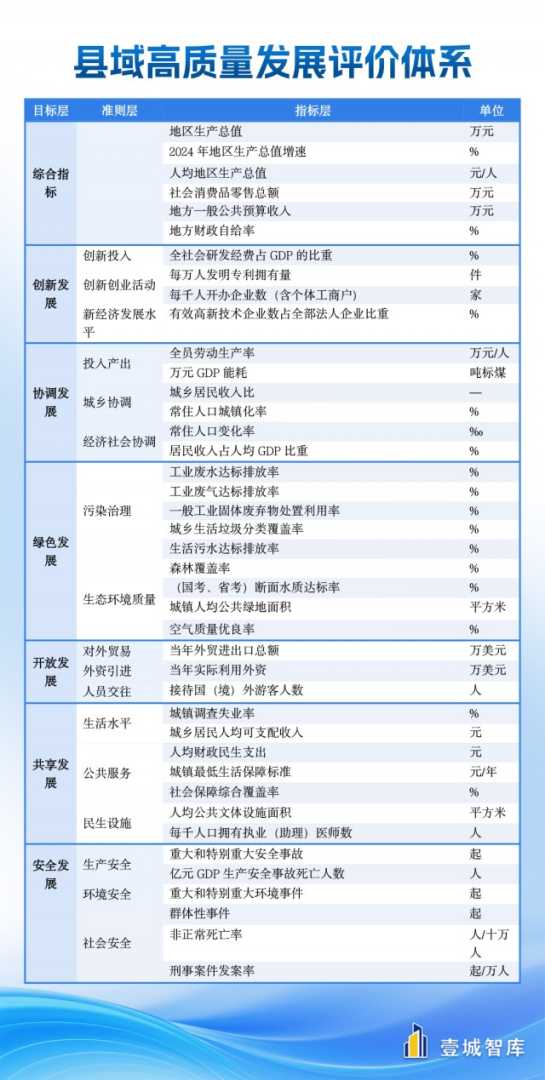 报告强调,新时代以来,县域已实现从“基础单元”到“战略支点”的历史性转变。为引导县域对标高质量发展要求,壹城智库构建了包含五大维度及四十余项具体指标的评价模型,力求全面刻画县域发展质量。