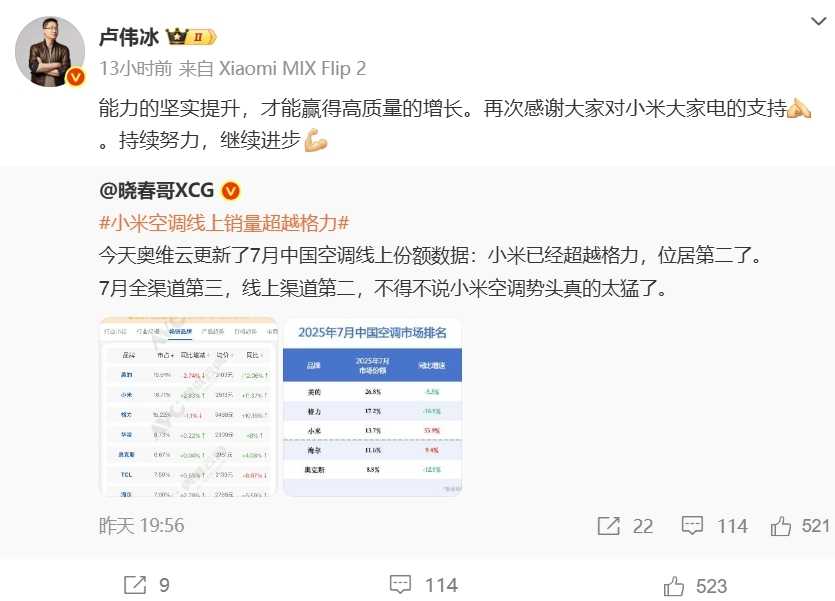 对此,小米集团合伙人、总裁,手机部总裁,小米品牌总经理卢伟冰8月16日发文表示:“能力的坚实提升,才能赢得高质量的增长。再次感谢大家对小米大家电的支持。持续努力,继续进步”。