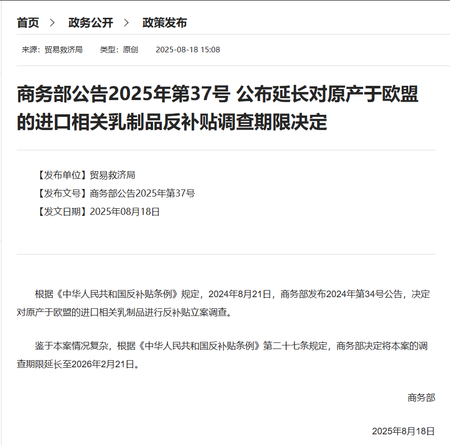 商务部发布公告,决定延长对原产于欧盟的进口相关乳制品反补贴调查期限至2026年2月21日,以全面评估补贴影响。