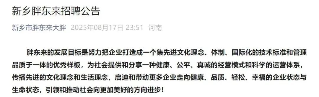2025年8月17日晚,新乡胖东来正式发布招聘公告,计划为“三胖”新店开业招聘900名员工。