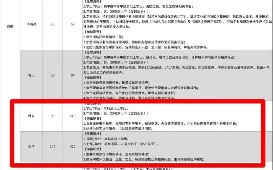 《新乡胖东来招聘公告》对新店招聘的基础标准、具体岗位、岗位的要求、报名安排及面试安排等事项做了规定。其中,在保安、保洁岗位一栏,要求招聘人员具有本科及以上学历,年龄25周岁以下(含25周岁)。