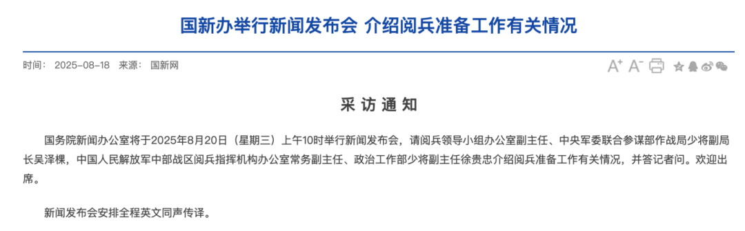 国新办将于2025年8月20日介绍阅兵准备工作。此前,北京天安门地区已举行两次纪念中国人民抗日战争暨世界反法西斯战争胜利80周年大会综合演练,均达预期目标,检验了组织保障和指挥运行工作。