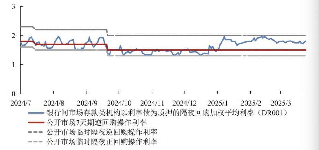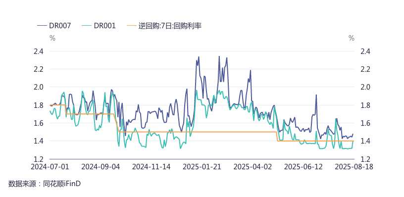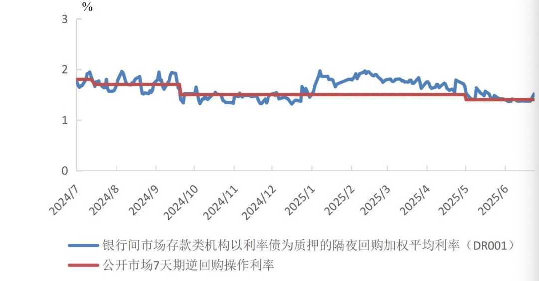 在《2025年第二季度中国货币政策执行报告》中,央行在展示货币市场利率走势时继续选用了DR001这一指标,而DR001围绕7天逆回购利率波动。