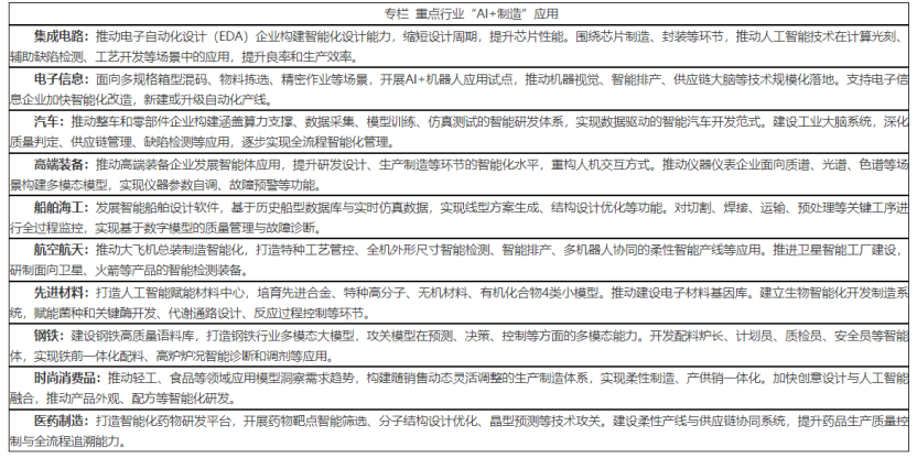针对重点行业,《实施方案》要求,聚焦集成电路、电子信息、汽车、高端装备、船舶海工、航空航天、先进材料、钢铁、时尚消费品、医药制造等行业,推动企业创新应用人工智能技术,打造细分领域行业模型,发展面向特定场景的专用小模型,构建多层次工业模型体系,提升大模型和小模型的协同效率,加快在工业场景中落地应用。