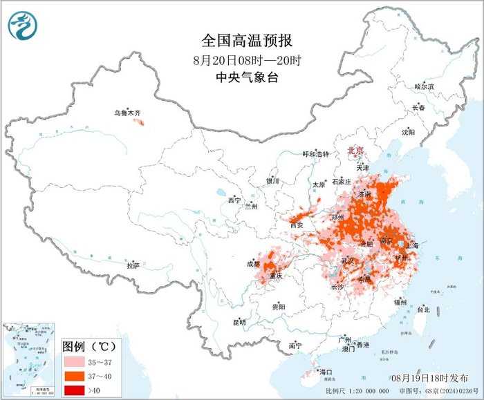 中央气象台8月19日18时继续发布高温黄色预警:预计8月20日白天,黄淮大部、江淮、江汉、江南中北部、陕西南部和关中地区、四川盆地等地的部分地区有35~39℃的高温天气,其中,陕西关中、河南中部、山东中部和西南部、浙江中西部等地局地最高气温可达40℃以上。高温天气对户外作业及民众生活影响显著,需加强防范。