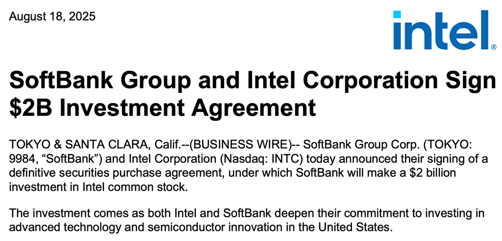 软银集团宣布对英特尔进行20亿美元投资,每股价格为23美元,此举使软银跻身英特尔前十大股东。特朗普政府亦考虑将《芯片和科学法案》资助转换为股权,收购英特尔约10%股份。