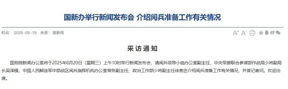 国务院新闻办将举行阅兵准备情况新闻发布会