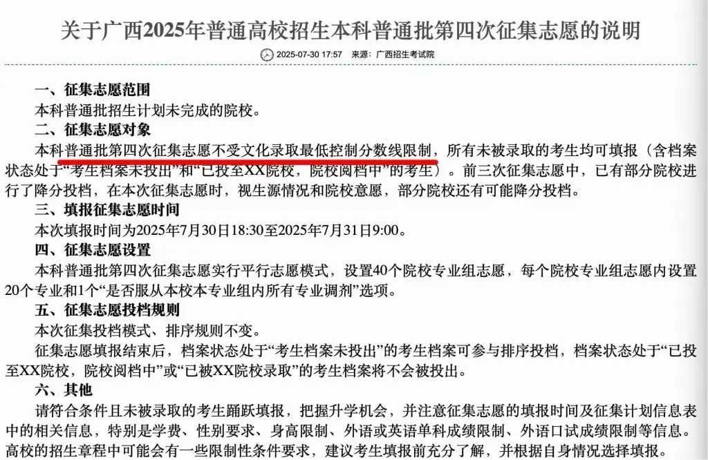7月30日,广西开始普通本科招生第四次志愿征集,且不受文化录取最低控制分数线限制。来源:网络截图