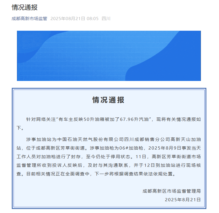 财联社8月21日讯,四川成都高新区市场监督管理局就“50升油箱被加67.96升油”事件发布通报,涉事加油站为中国石油高新天山加油站,加油枪已封存停用,市场监管部门正全面调查。