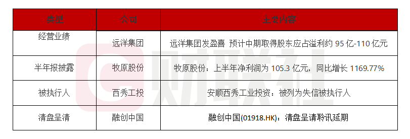 远洋集团预计中期股东应占溢利95亿-110亿元,同比扭亏;牧原股份上半年净利润105.3亿,同比增1169.77%。安顺西秀工投被列为失信被执行人,融创中国清盘呈请聆讯延期。