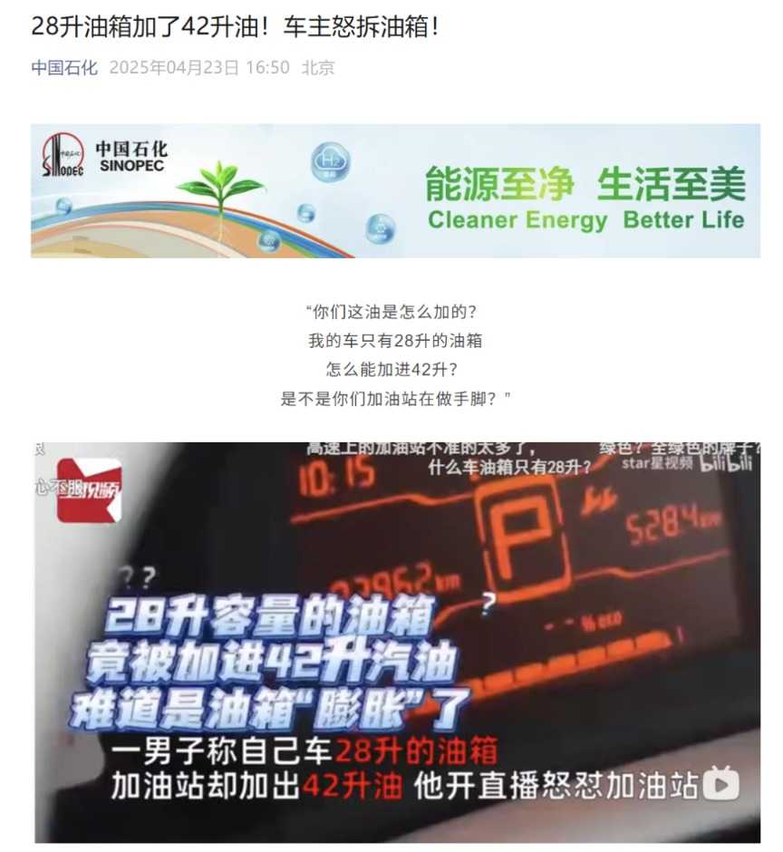 不过,有时车主认为被“多加油”“做手脚”,也可能存在“乌龙”情况。今年4月,中国石化官微即分享了一则“28升油箱加了42升油车主怒拆油箱”的案例。