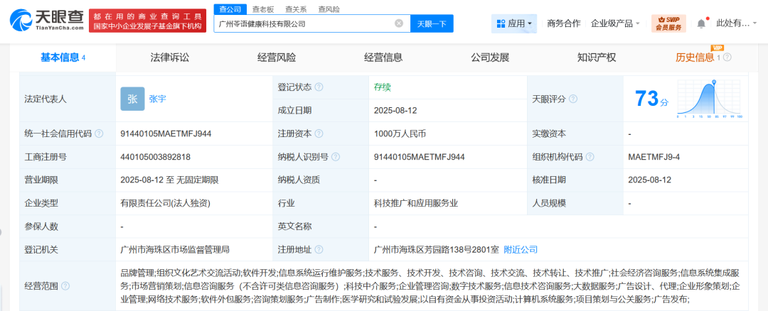 值得注意的是,今年8月,广州灵知智慧科技有限公司又出资成立了新公司“广州苓语健康科技有限公司”,注册资本1000万元,经营范围含品牌管理、组织文化艺术交流活动、软件开发、信息系统运行维护服务、社会经济咨询服务、信息系统集成服务、市场营销策划、信息咨询服务等。