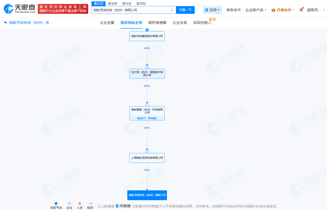 此前4月,一家名为广州灵知智慧科技有限公司的企业已先行成立,法定代表人同样为张俊杰,注册资本为1亿元,经营范围含广告发布、信息技术咨询服务、大数据服务、信息系统运行维护服务、信息系统集成服务、网络技术服务等。股权全景穿透图显示,该公司由上海云鑫创业投资有限公司全资持股,后者为蚂蚁科技集团全资子公司。
