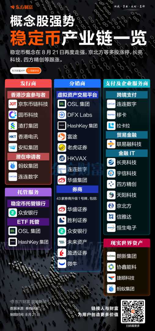 8月21日稳定币概念领涨题材榜,政策面发酵成核心因素。高盛预测USDC将大幅增长,稳定币潜在市场规模达数万亿美元。海通国际梳理了稳定币产业链和相关标的。