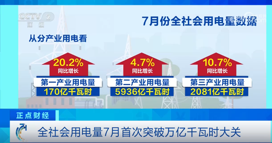 (央视财经《光华一见》)国家能源局最新发布的数据显示,7月份我国全社会用电量首次突破1万亿千瓦时,同比增长8.6%,用电增长成为经济活力新指标。这一纪录不仅是电力行业发展的里程碑,也是衡量中国经济活力的注脚。