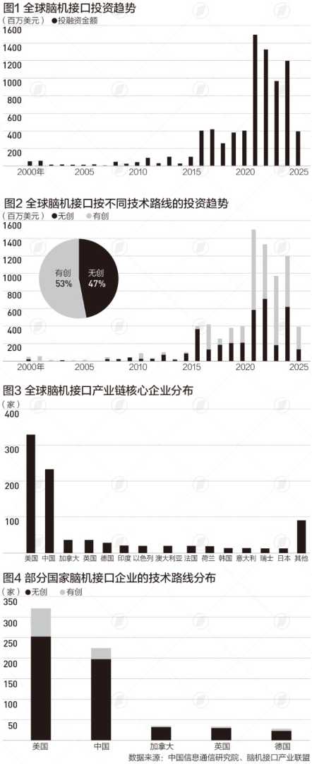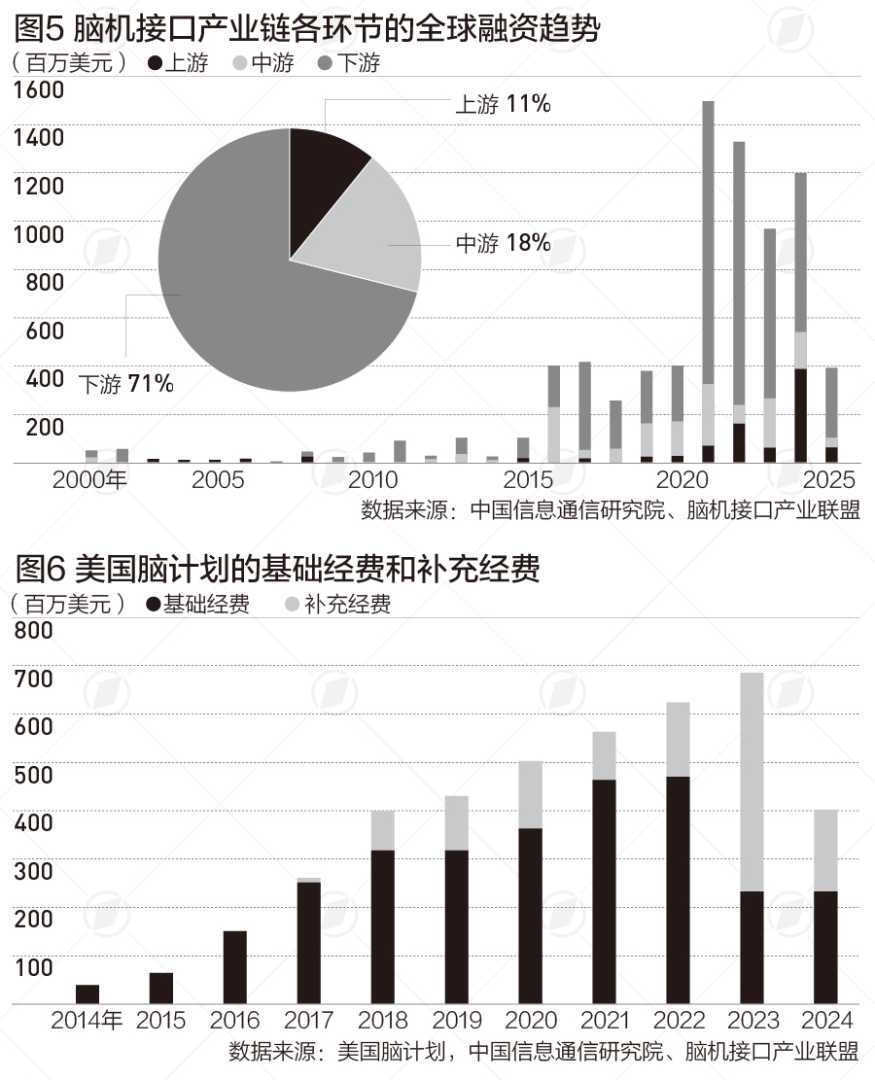 据中国信息通信研究院统计数据显示,截至2025年4月底,在脑机接口领域,已公开的全球投融资交易笔数累计超过1000笔,投资总额接近100亿美元。自2021年起,脑机接口下游领域获投资金额激增,“当前,投资方在脑机接口领域的兴趣明显向医疗健康方向聚焦,且‘投早投小’的投资态度成为趋势。”报告分析称。