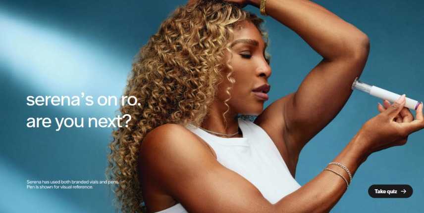 美国远程医疗平台Ro迎来了一位重量级代言人:23个大满贯得主、美国网球名将塞蕾娜·威廉姆斯(Serena Williams,小威廉姆斯)。Ro官网首页显示,小威已成为该平台GLP-1药物最新的代言人,广告语为“塞蕾娜已经登陆ro了,你是下一个吗?”小威声称,她已借助这类药物减掉了31磅(略超14公斤)体重,展现了GLP-1药物在减重方面的显著效果。