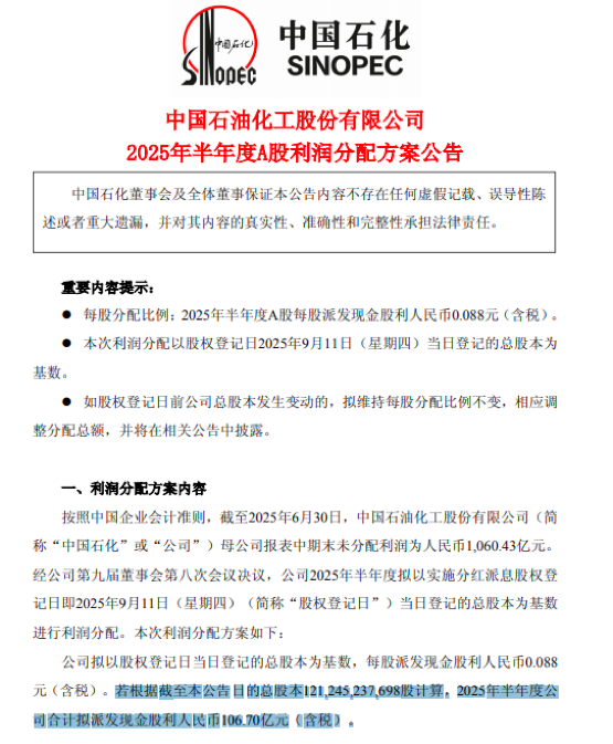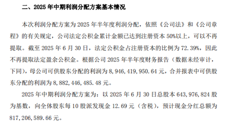 中国石化公告显示,公司拟以股权登记日当日登记的总股本为基数,每股派发现金股利0.088元(含税)。若根据截至公告日的总股本1212.45亿股计算,2025年半年度公司合计拟派发现金股利106.70亿元(含税)。柏楚电子2025年半年度利润分配方案显示,公司拟向全体股东每10股派发现金红利6.66元(含税)。若以截至2025年6月30日公司总股本2.88亿股计算,拟派发现金红利总额为1.92亿元(含税),占公司2025年半年度归母净利润的30.01%。
