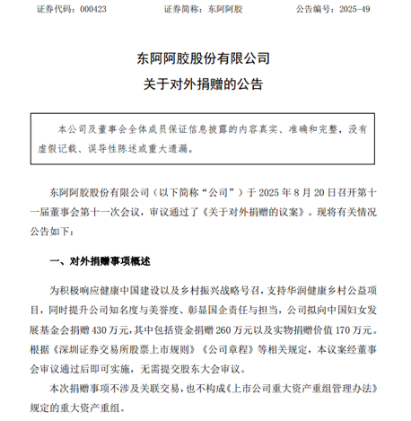 业绩稳健增长的同时,东阿阿胶持续提升股东回报。据东阿阿胶披露,自1999年首次分红以来,公司已累计分红92.87亿元。同日晚间,东阿阿胶亦公告称,为积极响应健康中国建设以及乡村振兴战略号召,支持华润健康乡村公益项目,同时提升公司知名度与美誉度、彰显国企责任与担当,公司拟向中国妇女发展基金会捐赠430万元,其中包括资金捐赠260万元以及实物捐赠价值170万元。