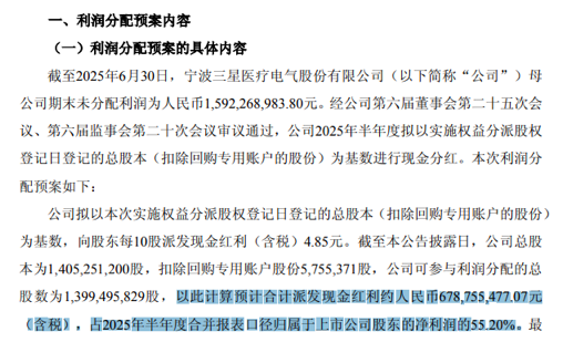 三星医疗2025年半年度利润分配预案显示,公司拟以本次实施权益分派股权登记日登记的总股本(扣除回购专用账户的股份)为基数,向股东每10股派发现金红利(含税)4.85元,预计合计派发现金红利约6.79亿元(含税),占2025年半年度归母净利润的55.20%。此外,扬农化工拟向全体股东每10股派发现金红利2.40元(含税)。以实施权益分派股权登记日登记的总股本4.05亿股计算,拟派发现金红利9729.57万元(含税),占公司上半年归母净利润的12.07%。依依股份拟向全体股东每10股派发现金红利2.40元(含税),共预计分配现金股利4419.85万元,占当期归母净利润的43.25%。