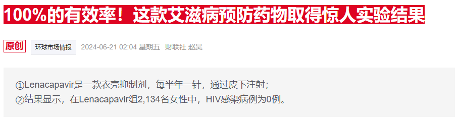 据了解,这种抗艾药物名为“来那卡帕韦”(lenacapavir,在美国的商品名为Yeztugo),是一款衣壳抑制剂,每次注射可为人体提供6个月的保护,在医药研发领域意义重大。