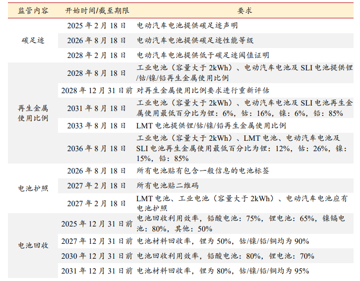 2023 年 8 月 17 日,欧盟《电池与废电池法规》正式生效,明确电池生产者要承担废电池回收责任,包括建立回收网络并支付处理费用。同时,对碳足迹、再生金属使用比例、电池标签与电池护照、废旧电池及电池材料的回收、化学性能与耐久性及供应链尽职调查等方面都提出了明确监管要求和市场准入门槛——这成为中国企业开拓欧洲市场的催化。