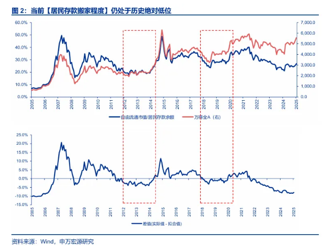 2005年以来我国出现过五次明显的居民存款搬家,分别为2006—2007年、2009年、2012—2015年、2021年和2024—2025年。招商证券王先爽认为,居民存款快速迁徙资本市场,大概率是资本市场热度的结果,而非原因。浙商证券李超表示,根据历史情况,居民存款加速搬家往往对应牛市中后期,居民存款入场后将进一步放大股市赚钱效应。