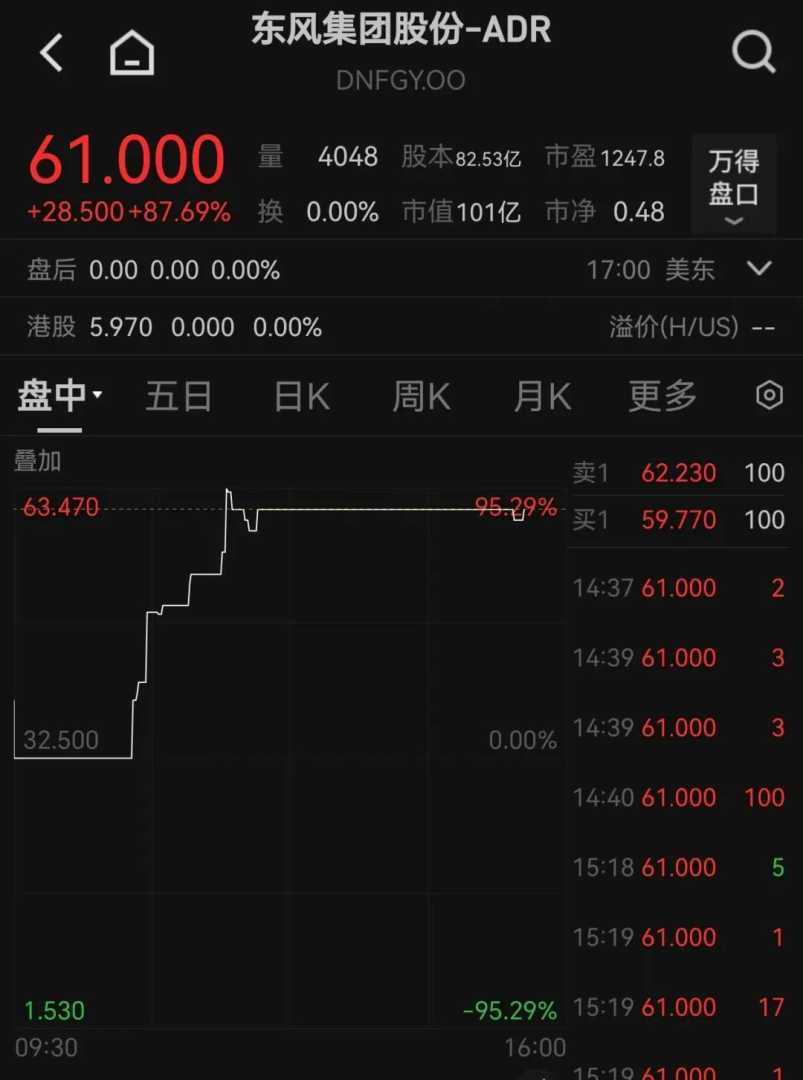 22日晚公告一出,截至8月23日零点,东风集团股份ADR报价62.22美元,一个小时内暴涨超91%;收盘涨幅为87.69%,报61美元,股价波动显著。