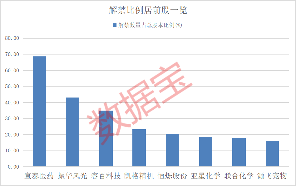 从解禁比例来看,宣泰医药的解禁比例居首,达68.61%,振华风光、容百科技、凯格精机的解禁比例居前。
