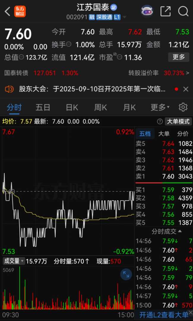 投资者关注到,上述委托理财总额接近江苏国泰当前总市值。截至8月22日收盘,江苏国泰股价报7.60元/股,总市值为123.7亿元。