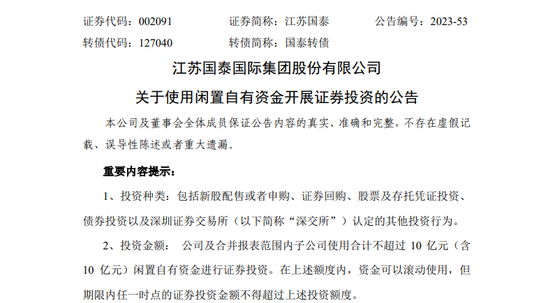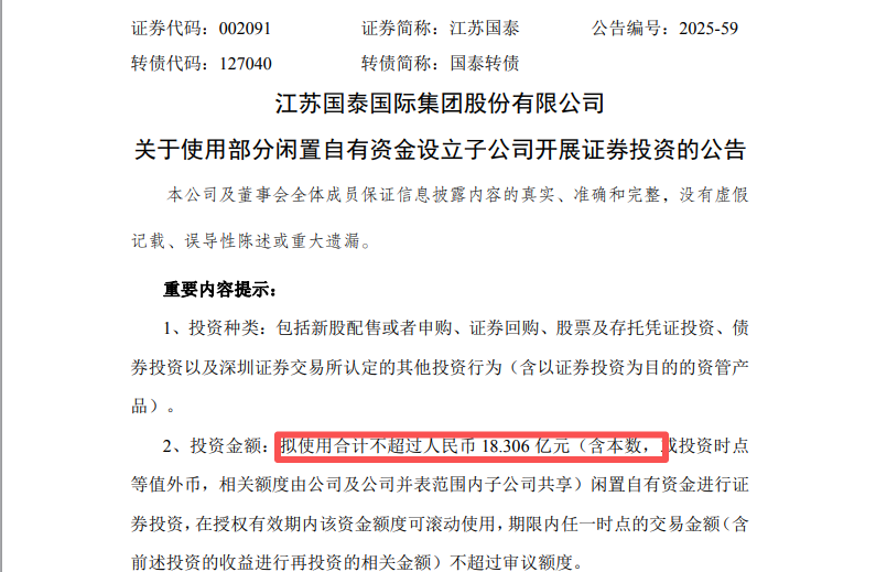 公告显示,8月21日,江苏国泰董事会审议通过议案,同意公司及下属公司使用闲置自有资金不超过18.306亿元(含)开展证券投资,包括新股配售或申购、证券回购、股票及存托凭证投资、债券投资,以及深交所认定的其他投资行为(含以证券投资为目的的资管产品)。
