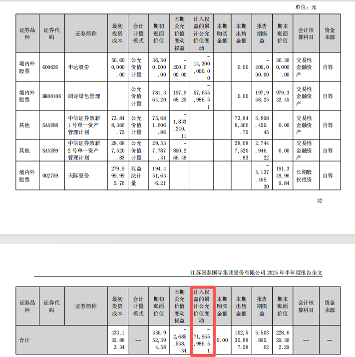 近年来,江苏国泰的证券投资收益不甚理想。2023年、2024年及2025年上半年,江苏国泰证券投资计入权益的累计公允价值变动分别为-6045.51万元、-6927.04万元及-7195.60万元,凸显投资风险。