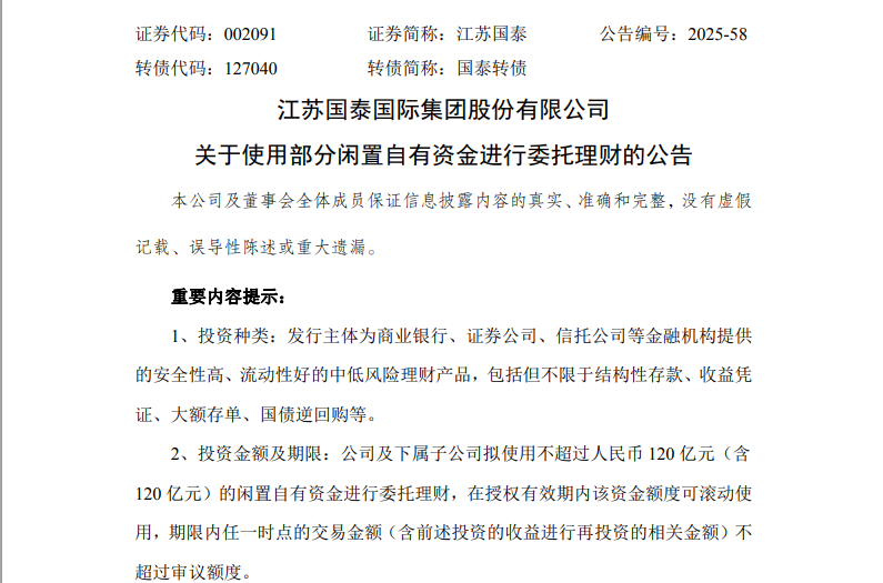 公告显示,8月21日,江苏国泰召开董事会审议通过议案,同意公司及子公司使用闲置自有资金不超过120亿元(含)进行委托理财,使用期限自股东大会审议通过之日起12个月内滚动使用。
