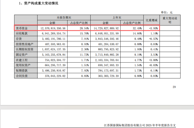 江苏国泰的货币资金余额呈现下滑态势,2025年6月末为125.71亿元,2024年12月末为147.30亿元,需关注资金流动性。