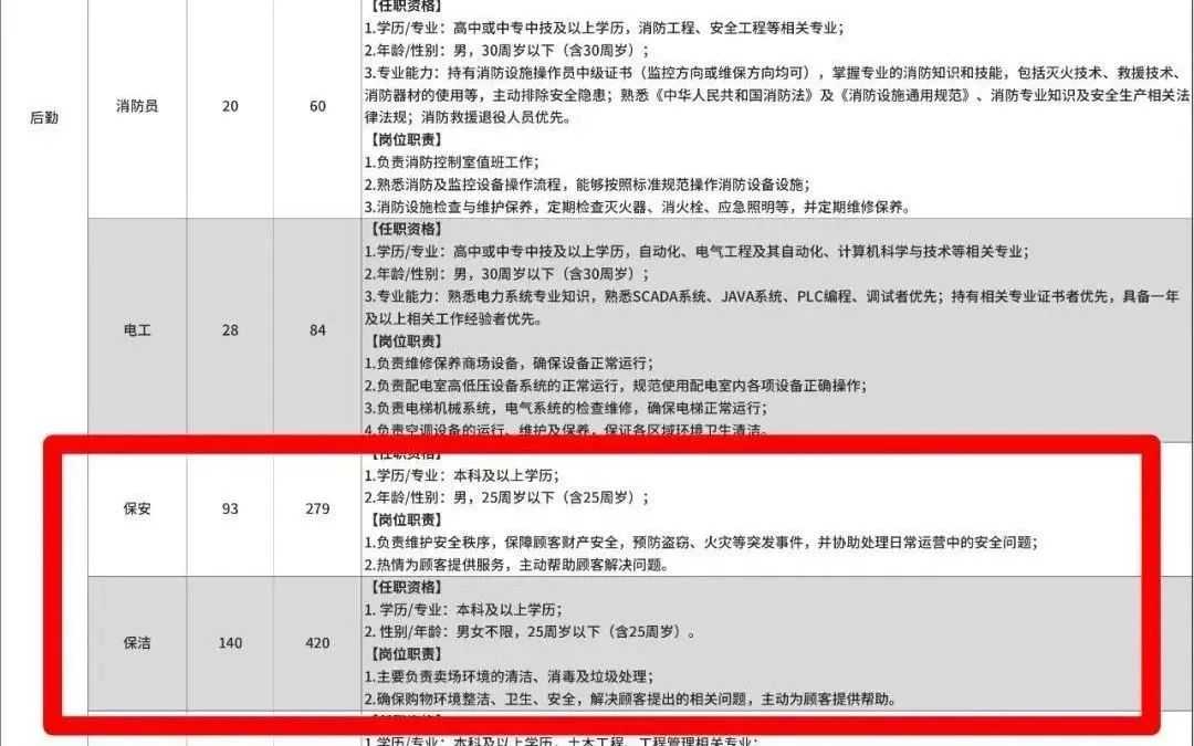 保安、保洁岗位,要求招聘人员本科及以上学历,年龄25周岁以下(含25周岁)。此次简历投递中,两个岗位也都已报满。