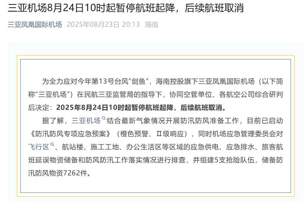 8月23日晚,三亚凤凰国际机场发文称,为全力应对今年第13号台风“剑鱼”,海南控股旗下三亚凤凰国际机场(以下简称“三亚机场”)在民航三亚监管局的指导下,协同空管单位、各航空公司综合研判后决定:2025年8月24日10时起暂停航班起降,后续航班取消,确保旅客安全。
