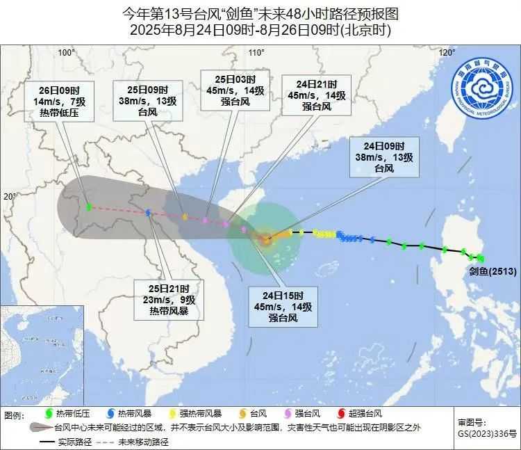 预计,“剑鱼”将以每小时20公里的速度继续向西偏北方向移动,强度继续加强,逐渐靠近海南岛南部沿海,并将于24日下午到傍晚在海南陵水到乐东一带沿海登陆或从近海擦过(13~14级,40~45米/秒,台风级或强台风级),之后趋向越南中北部沿海。此次台风路径明确,海南南部和西部沿海将承受最大影响,相关部门已做好充分准备。