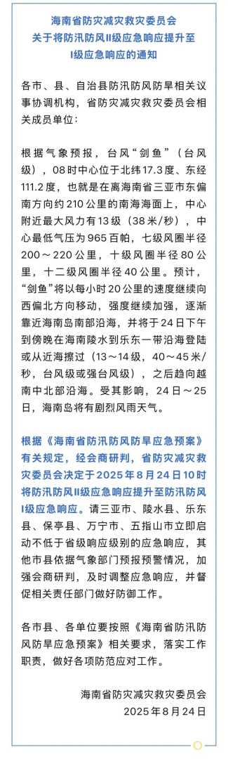 据海南发布,海南省防灾减灾救灾委员会决定于2025年8月24日10时将防汛防风Ⅱ级应急响应提升至防汛防风Ⅰ级应急响应。请三亚市、陵水县、乐东县、保亭县、万宁市、五指山市立即启动不低于省级响应级别的应急响应,其他市县依据气象部门预报预警情况,加强会商研判,及时调整应急响应,并督促相关责任部门做好防御工作,确保台风期间安全。