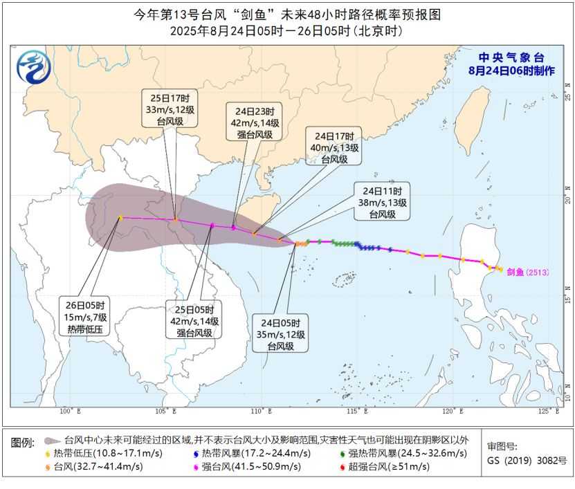 大风预报:8月24日08时至25日08时,南海大部、西沙群岛和中沙群岛附近海域、北部湾、琼州海峡、海南岛及沿海、广西沿海、广东中西部沿海将有6-8级大风,其中南海西北部和中西部及西沙群岛部分海域、北部湾中部和南部海域、海南岛沿海的风力有9-11级,“剑鱼”中心经过的附近海域或地区的风力可达12-14级、阵风15-16级。
