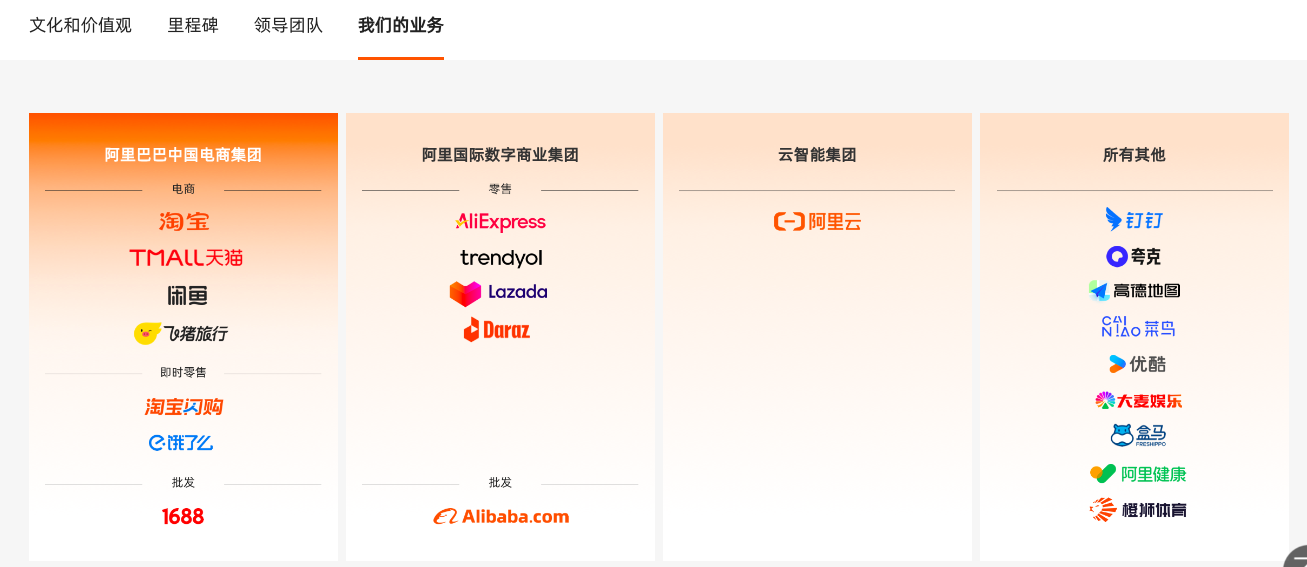 红星资本局8月24日消息,阿里巴巴集团官网显示,其原有的六大业务集团被划分为四大业务类别,分别为阿里巴巴中国电商集团、阿里国际数字商业集团、云智能集团以及所有其他业务,这一业务重组举措彰显了阿里巴巴在电商领域的持续深耕。图片来自阿里巴巴集团官网