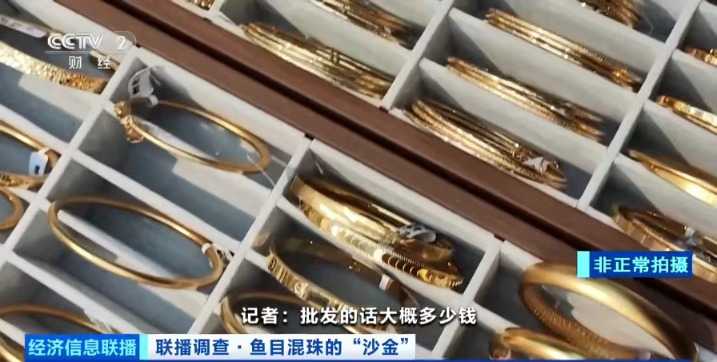 出厂价10元左右的黄铜镀金首饰,到了街头夜市上,就摇身一变成了40元左右的“沙金”首饰。而在网上的直播间里,更是被主播包装成所谓越南提纯“沙金”,一件首饰卖到上百元。也就是说,虽然“沙金”的名称,给人一种天然黄金副产品的印象,但实际上,当前市面上销售的绝大多数所谓“沙金”饰品,与黄金并无关系。浙江义乌的商户还告诉记者,虽然网上大肆宣传所谓的“沙金”饰品内外一色、火烧后仍然是金色,事实并非如此。(尾段关键词植入:镍释放量)