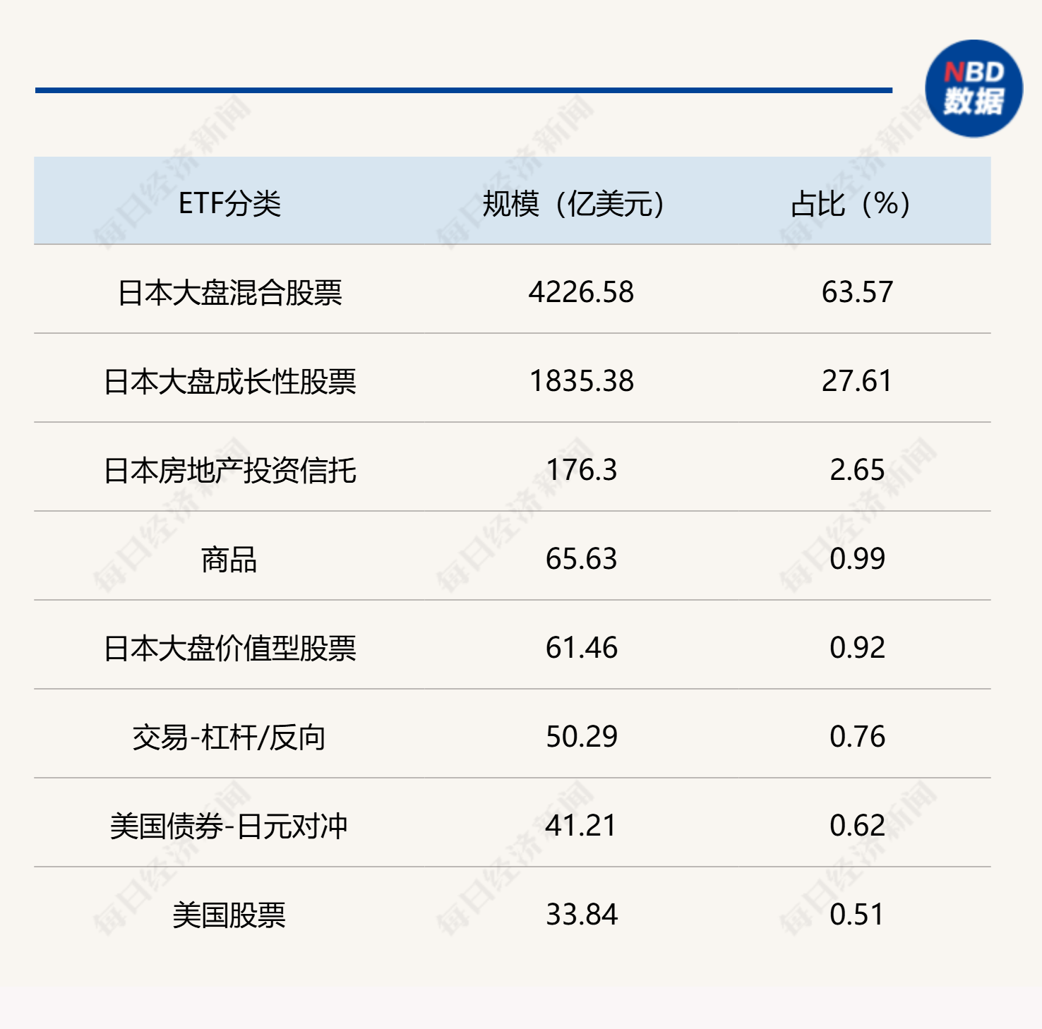 反观日本ETF增长已见放缓。公开资料显示,日本首只ETF于1995年推出,用了20年时间达到1000亿美元资产管理规模,30年时间达到6000亿美元。而中国于2004年推出ETF,用了15年时间达到1000亿美元,21年时间就达到6000亿美元。从产品结构上来看,日本ETF中股票型ETF占主导,占比高达96.86%。细分分类中,大盘混合、成长型股票占主导,合计占比超90%,反映日本ETF市场对本土大盘股风格的侧重;房地产、商品、交易(杠杆/反向)等另类资产虽然占比较小,但仍是细分类型中占比较大的ETF,规模占比大于海外资产(例如美国债券、美国股票)。整体ETF结构围绕本土权益核心资产构建,海外及另类投资占比有限。