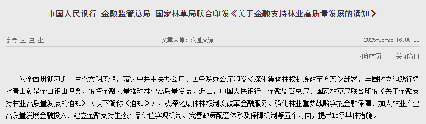 中国人民银行8月25日消息,近日,中国人民银行、金融监管总局、国家林草局联合印发《关于金融支持林业高质量发展的通知》,从深化集体林权制度改革金融服务、强化林业重要战略实施金融保障、加大林业产业高质量发展金融投入、建立金融支持生态产品价值实现机制、完善政策配套体系及保障机制等五个方面,提出15条具体措施,助力林业金融支持。这一政策出台为林业发展注入新动力,推动林业迈向高质量发展新阶段。