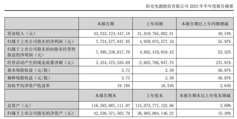 阳光电源发布2025年半年度报告,上半年营收435.33亿元,同比增长40.34%;净利润77.35亿元,同比增长55.97%。公司决定向股东派发现金股利。