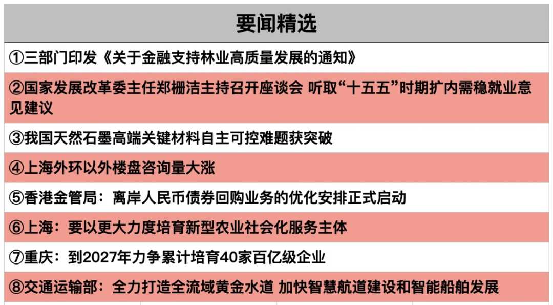 ①近日,中国人民银行、金融监管总局、国家林草局联合印发《关于金融支持林业高质量发展的通知》,《通知》要求,要用好结构性货币政策工具,拓宽涉林企业直接融资渠道,加大林业领域资金支持,助力绿色低碳转型。