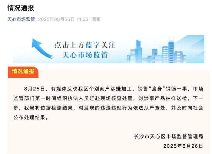 8月26日,长沙市天心区市场监管局通报,针对个别商户涉嫌加工、销售“瘦身”钢筋一事,已组织执法人员核查并抽样送检,将依法查处违法违规行为,保障建筑安全与钢材质量。