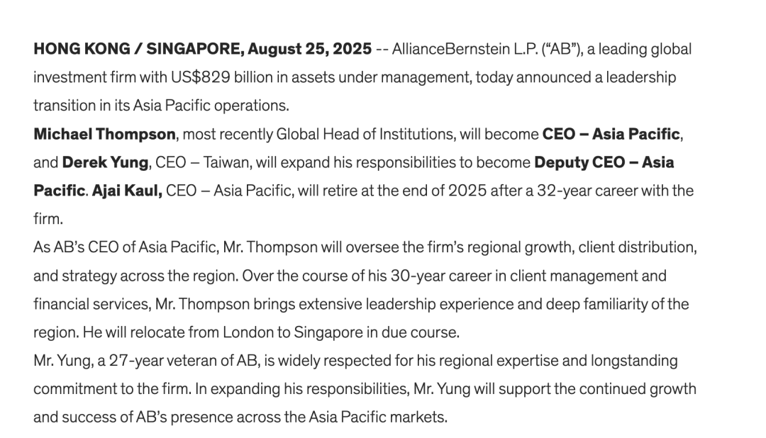在同一篇新闻稿中,联博表示,Derek Yung在联博任职27年,他将支持联博在亚太市场的持续增长和成功。联博总裁兼首席执行官Seth Bernstein表示,两位都有全球客户经验和运营成功记录,期待新的领导团队能带领联博扩张在该地区的业务版图,服务更多样化的客户。