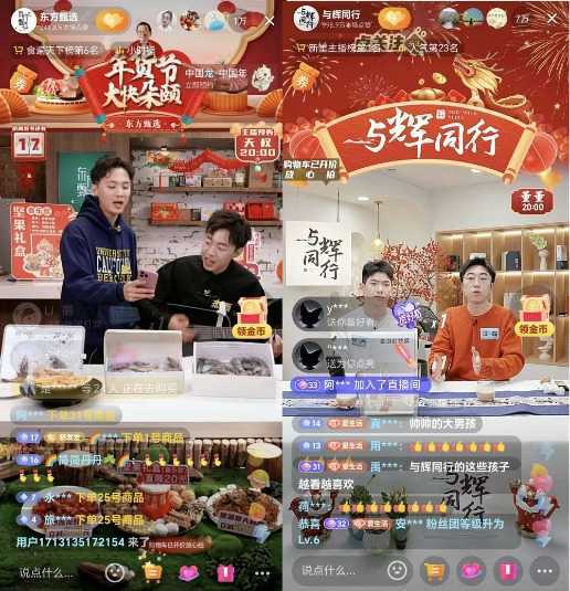 1月24日晚,东方甄选、与辉同行直播间同一时间表演才艺人气对比